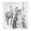 | Abe Lincoln, with Tad on the horse, Willie in front of decorated lamp post on the streets of Springfield, Illinois in 1860. Willie is giving an apple to the horse. | |