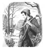 | Abe Lincoln with his ax in the woods sees a deer, Christmas, Springfield, Illinois in 1839. Snow and holly bushes are visible, along with a growing Christmas tree. | |