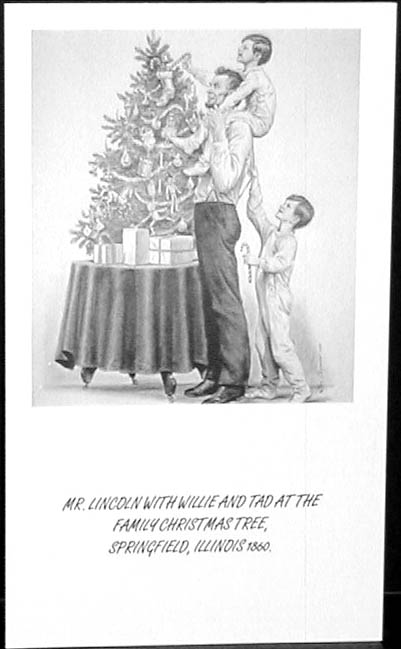 Mr. Lincoln with Willie and Tad at the family Christmas tree in Springfield, Illinois in 1860. Willie and Tad are getting candy canes from the tree. | |||