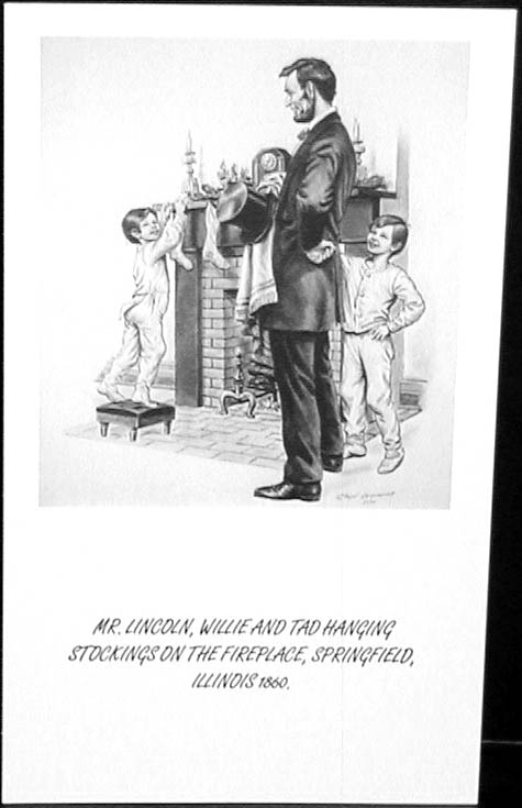 Mr. Lincoln, Willie and Tad hanging stockings on the fireplace in Springfield, Illinois in 1860. Tad is on a stool while Willie is looking at his Father. Lincoln is looking on and smiling, hat and shawl in hand. | |||