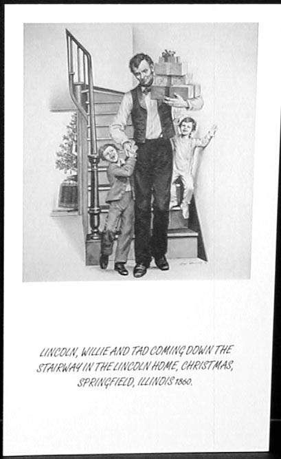 Lincoln, Willie and Tad coming down the stairway in the Lincoln home, Christmas in Springfield, Illinois in 1860. Mr. Lincoln is carrying packages while Willie and Tad would like to get at them. | |||