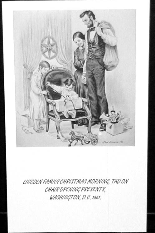 | Lincoln family Christmas morning, Tad on chair opening presents in Washington, D.C. in 1861. President and Mrs. Lincoln are looking on while Willie watches Tad unwrap a present. The Lincoln's are holding hands and the President has a bag of toys slung over his shoulder. | |||