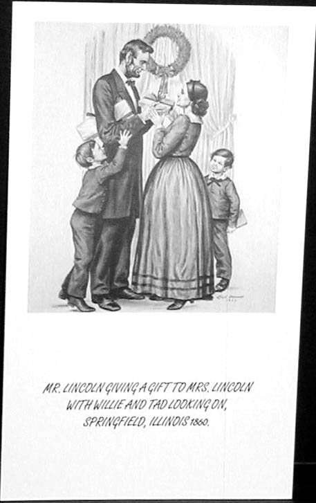 Mr. Lincoln giving a gift to Mrs. Lincoln with Willie and Tad looking on, Springfield, Illinois in 1860. | |||