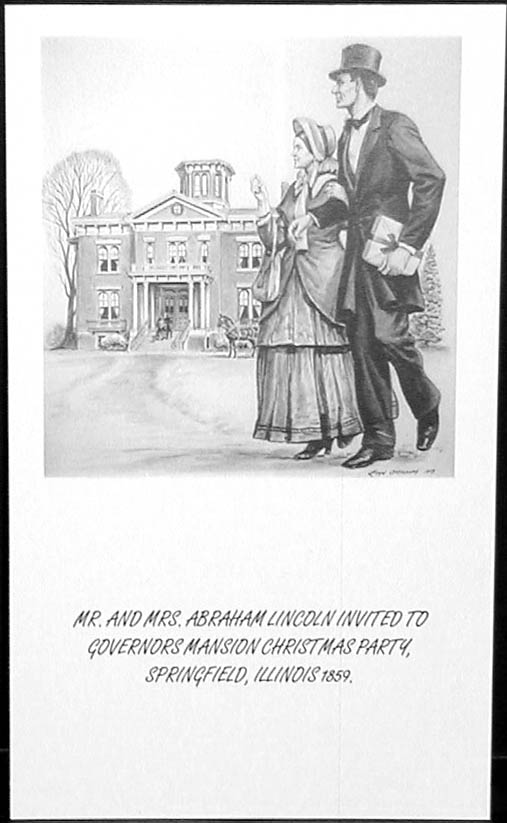 Mr. and Mrs. Abraham Lincoln invited to Governors Mansion Christmas party in Springfield, Illinois in 1859. Mr. Lincoln is carrying a package. Another couple are going up the steps. | |||