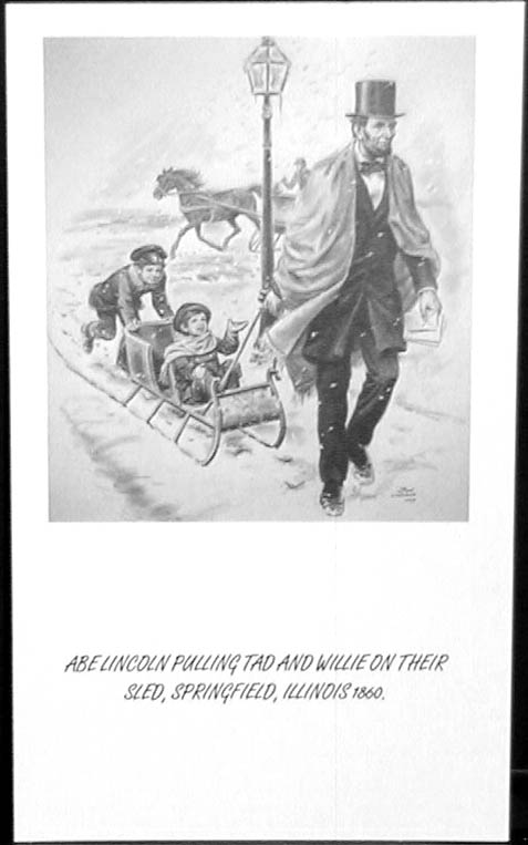 Abe Lincoln pulling Tad and Willie on their sled in Springfield, Illinois in 1860. Lincoln is carrying mail. A horse and sleigh are in the background. | |||