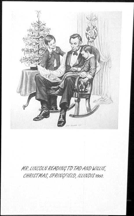 Mr. Lincoln reading to Tad and Willie on Christmas in Springfield, Illinois in 1860. This reading scene shows the Santa Claus picture on the book. There is a small Christmas tree on a table behind Willie, and Tad is on his Father's lap. | |||