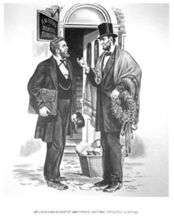 Abe Lincoln and his dentist, Amos French, Christmas in Springfield, Illinois in 1860. Lincoln is holding a wreath and wearing his shawl. A basket of presents is at his side.