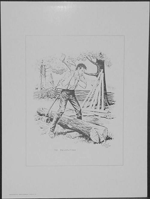Prints are from original art work owned and reproduced by George Borum Jr. 134-5-12 Subject: Lincoln splitting rails Description: 6" x 8" portrait print by Lloyd Ostendorf Print: (90 available) 6"x 8" 10.00 Each Negative: (1 available) 25.00 - ON RESERVE
