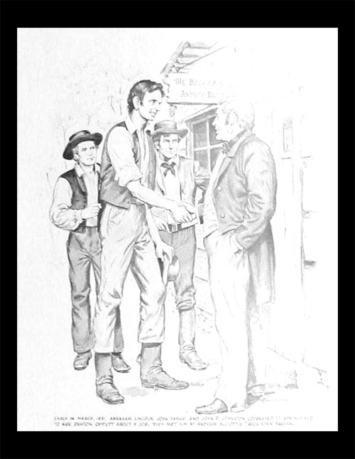 Description: Early in March 1831, Abraham Lincoln, John Hanks and John D. Johnston journeyed to Springfield to see Denton Offutt about a job. They met him at Andrew Elliott's Buckhorn Tavern.